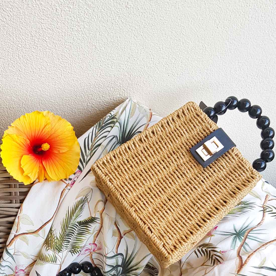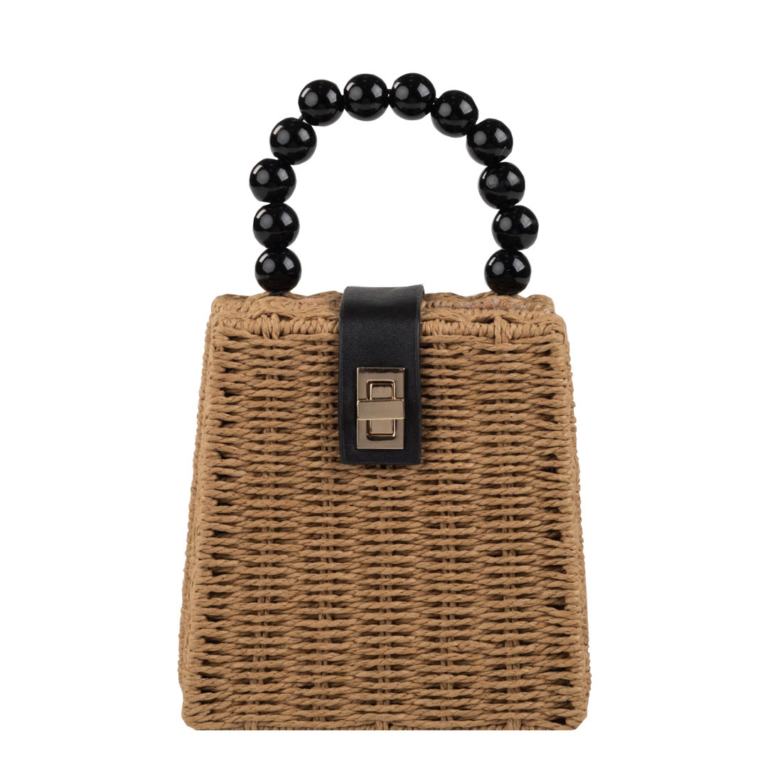 Κάμελ μπαμπού χειροποίητο τσαντάκι με διακριτικό κούμπωμα. Ανοίγει όμορφα σαν βαλιτσάκι και μέσα έχει φόδρα. Διαθέτει λουράκι για να κρεμιέται στον ώμο αλλά και χιαστί. Το εντυπωσιακό χαρακτηριστικό του χερούλι που θυμίζει σταθερό κολιέ από μαύρες χάντρες σίγουρα θα τραβήξει τα βλέμματα και θα κερδίσει τις εντυπώσεις.